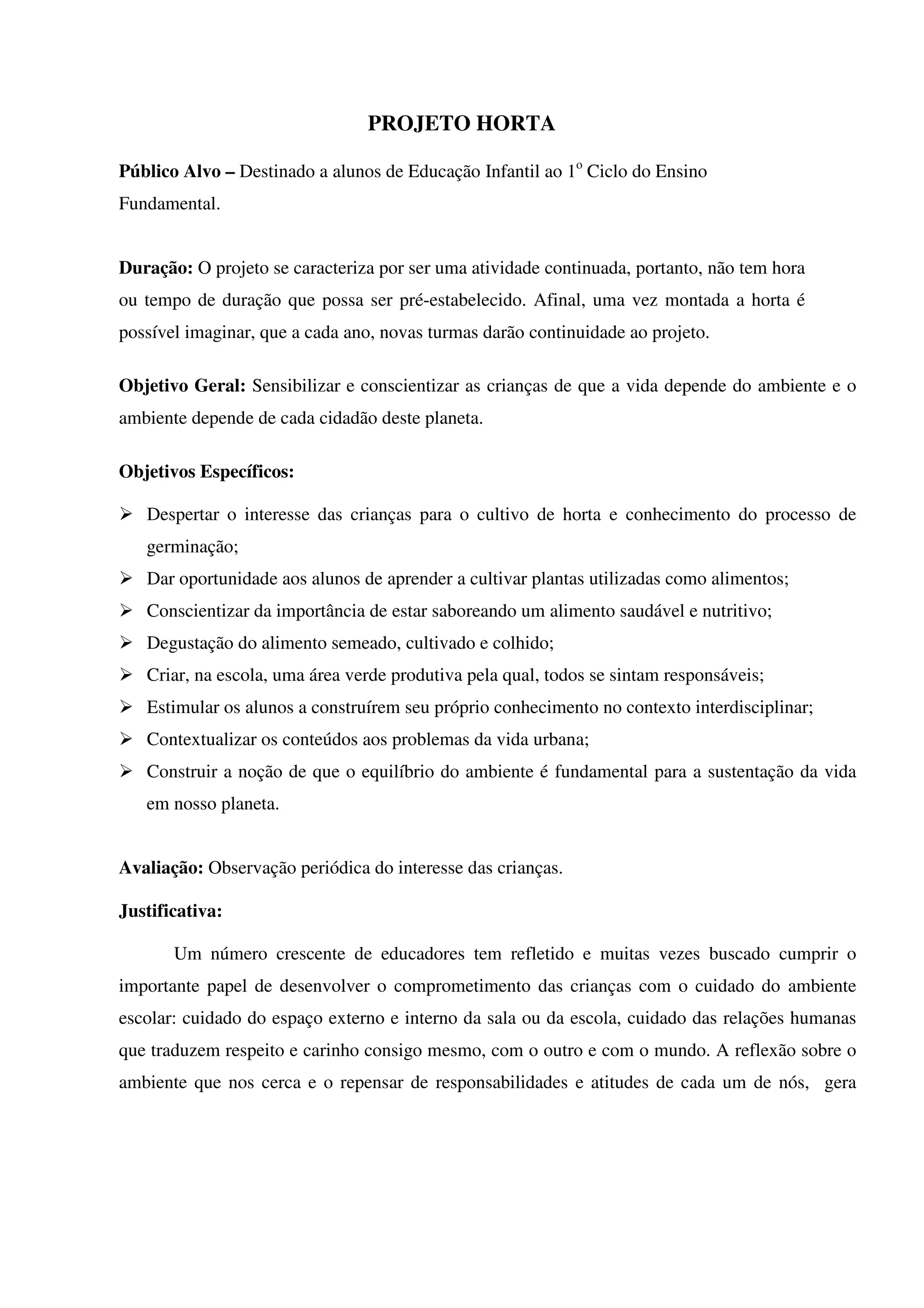 O projeto horta visa sensibilizar alunos sobre a importância do meio ambiente e da alimentação saudável por meio do cultivo de hortaliças. As crianças participam de todas as etapas, desde o plantio até a colheita e degustação dos alimentos, aprendendo sobre ciências na prática. A horta permite trabalhar temas de forma interdisciplinar e fornecer alimentos à merenda escolar.