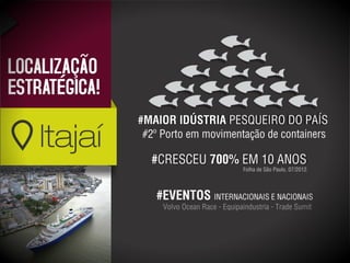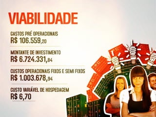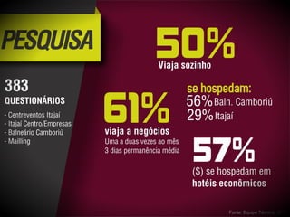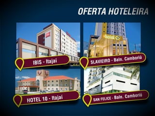 Este documento fornece distâncias de Itajaí para outras cidades e locais de interesse, como Joinville, Curitiba, Balneário Camboriú e Florianópolis. Ele também apresenta previsões de receita, taxa de ocupação e outras métricas para um hotel em Itajaí ao longo de 12 meses. Por fim, faz cálculos projetando o retorno do investimento inicial em diferentes períodos de tempo.