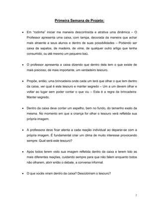 Este projeto visa ajudar crianças pré-escolares a desenvolverem sua autoconsciência e identidade. Os objetivos incluem ajudá-los a conhecerem a história de suas vidas, seus nomes, partes do corpo e preferências. As atividades propõem que as crianças descubram quem são elas mesmas através de dinâmicas, desenhos e conversas.