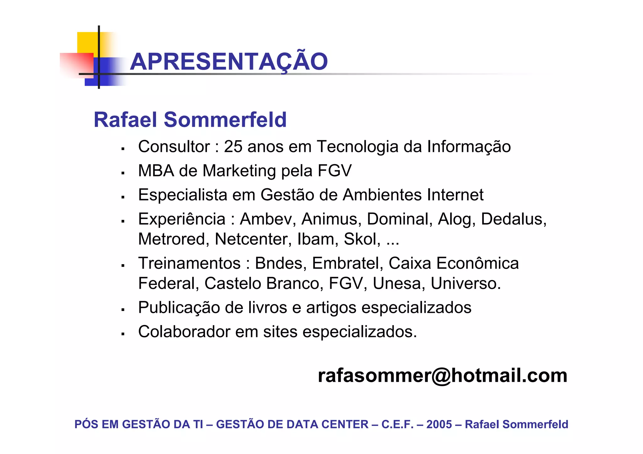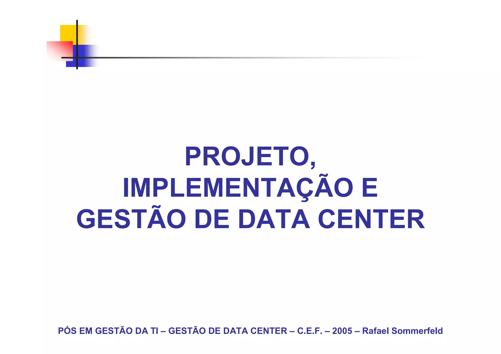 O documento aborda a gestão de data centers, apresentando conceitos, estruturas, e a importância desse ambiente para a operação de tecnologia da informação. Destaca a experiência do autor e inclui informações sobre produtos e serviços relacionados, bem como exemplos de data centers e suas características. Além disso, discute modelos de negócio e a segurança e conectividade necessárias para um data center eficiente.