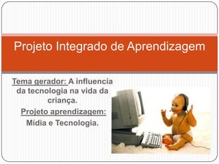 Este projeto desenvolvido na Escola Municipal Eurípedes Barsanulfo com alunos de 7-8 anos analisou a influência da tecnologia na vida das crianças. Os alunos aprenderam a digitar textos, jogar jogos didáticos no computador e pesquisar na internet enquanto os professores também aprimoraram suas habilidades com a tecnologia. O projeto mostrou que as crianças e professores desenvolveram habilidades no uso do computador.