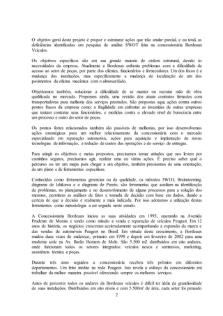 Este documento apresenta um projeto integrador de estudantes da Universidade X para propor ações que resolvam problemas identificados no setor de almoxarifado e expedição de peças de uma concessionária de veículos. O projeto utilizará ferramentas gerenciais como 5W1H, brainstorming e diagramas de Ishikawa e Pareto para analisar os problemas e propor soluções.