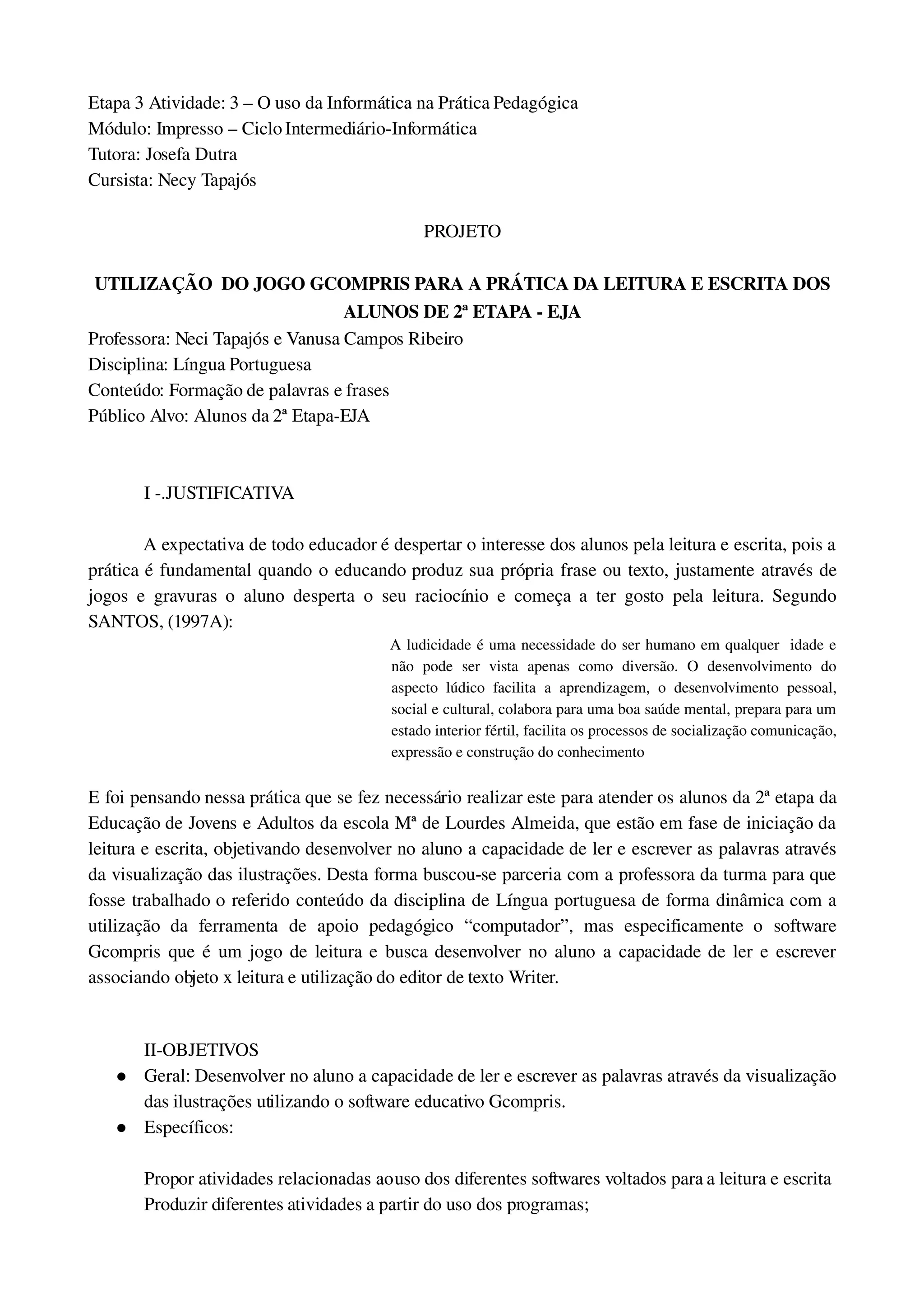 Este projeto propõe utilizar o jogo educativo Gcompris para desenvolver a capacidade de leitura e escrita de alunos do 2o ano do Ensino Fundamental através de atividades lúdicas. O projeto será realizado em março e utilizará o Gcompris para associar objetos às palavras e construir frases, depois os alunos escreverão as palavras e frases no caderno e no software Writer para avaliação.