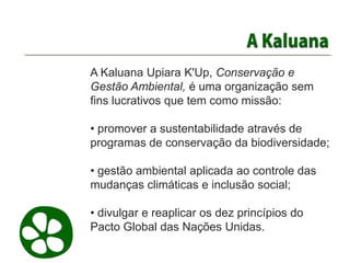 O documento descreve as atividades e objetivos da organização Kaluana Upiara K'Up Conservação e Gestão Ambiental, que promove a sustentabilidade através de programas de conservação da biodiversidade e gestão ambiental aplicada ao controle das mudanças climáticas e inclusão social. A organização também divulga os dez princípios do Pacto Global das Nações Unidas e fortalece estratégias empresariais relacionadas à sustentabilidade.