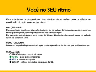 O documento descreve as novas largadas por ritmo que serão implementadas nas corridas da o2 para melhor acomodar atletas de diferentes níveis. Os corredores serão divididos em pelotões branco, verde, azul e quênia de acordo com seus tempos esperados, evitando empurrões e ultrapassagens desnecessárias.