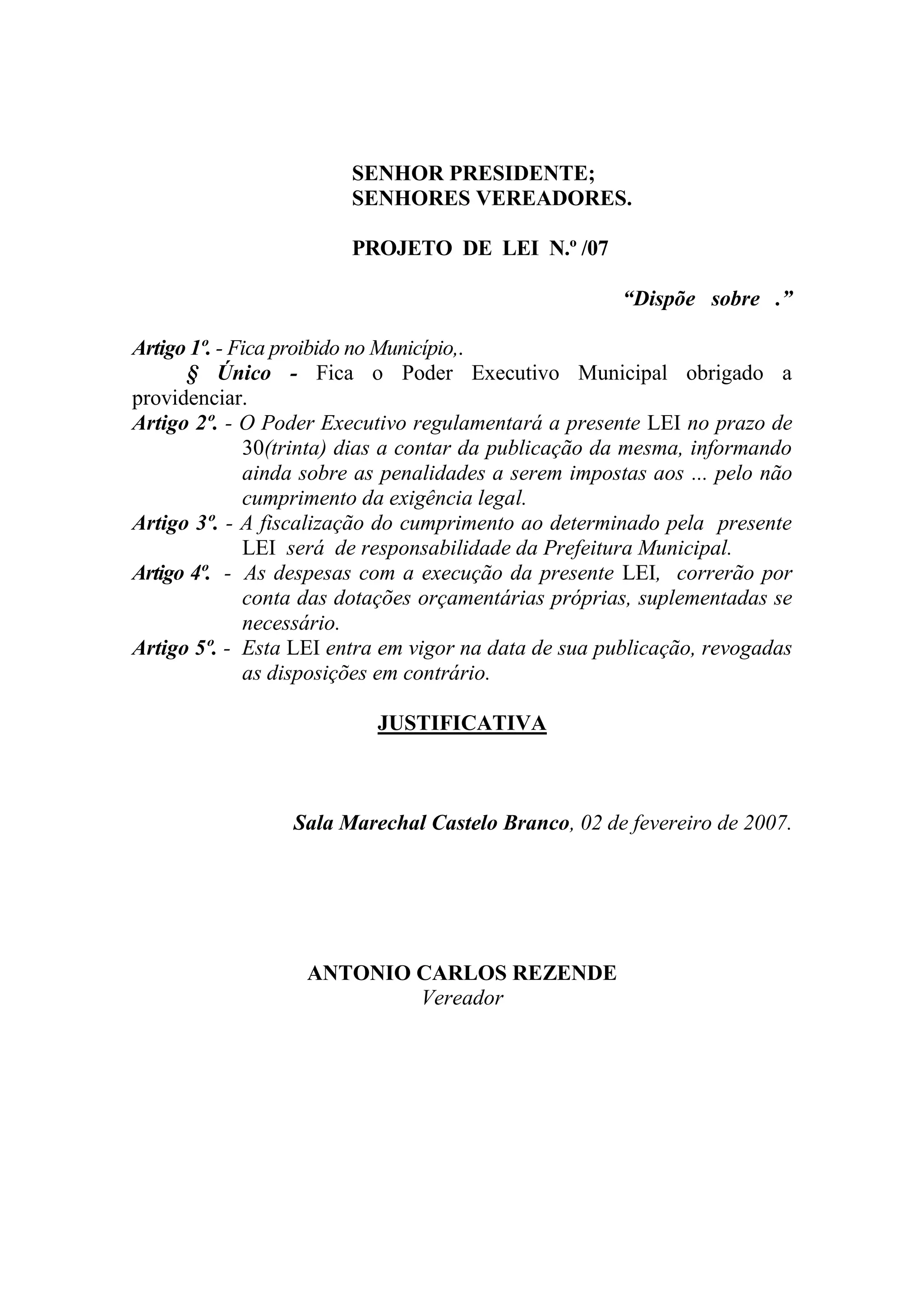 Este projeto de lei propõe proibir alguma coisa no município e obrigar o poder executivo a providenciar medidas. Ele também determina que o poder executivo regulamente a lei em 30 dias, estabeleça penalidades e fiscalize o cumprimento. A lei entra em vigor após publicação.