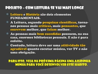 Este documento descreve um projeto chamado "Com Leitura se vai mais longe" que incentiva o hábito da leitura entre estudantes. O projeto pede que os estudantes leiam livros por 30 minutos a 1 hora por dia e escrevam uma redação de pelo menos 20 linhas sobre o que aprenderam e sentiram durante a leitura. Ao entregar a redação, os estudantes receberão pontos como incentivo.