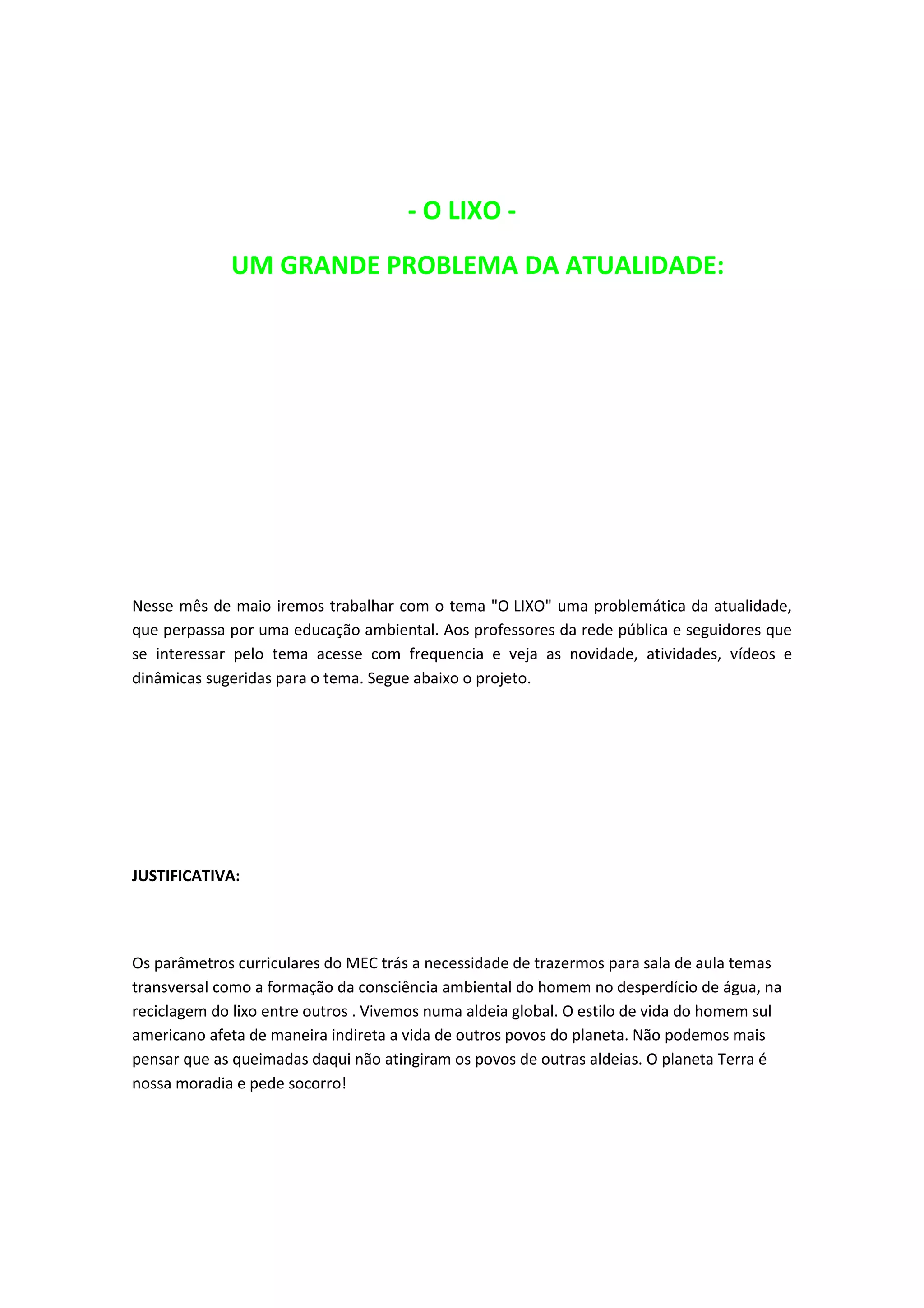 O documento discute a implementação de um projeto educacional sobre o tema "O Lixo" na rede pública de ensino. O projeto visa desenvolver a consciência ambiental dos alunos através de atividades que abordam a produção, descarte e reciclagem do lixo. O projeto utilizará debates, visitas a locais de coleta de lixo e entrevistas com catadores para ensinar os alunos a reduzir o desperdício.