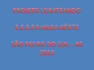 O Projeto de incentivo a leitura Lobateando aconteceu durante o ano de 2014 na escola. Alunos e professores dos anos iniciais foi o público alvo do Projeto que pretendeu destacar o Mundo Mágico de Monteiro Lobato realizando várias atividades relativas ao autor como: apreciação de livros de Monteiro Lobato, contação de Histórias, troca de idéias, dramatização, confecão de fantoches, desenhos, máscaras dos personagens, receitas brincadeiras, canções, danças entre outros. No encerramento do projeto dia 12 de novembro teve distribuição de brindes e um gostoso lanche com receitas de tia Nastácia e Dona Benta. A coordenação foi da professora Cecília M. Kaus que agradece a todos os participantes.