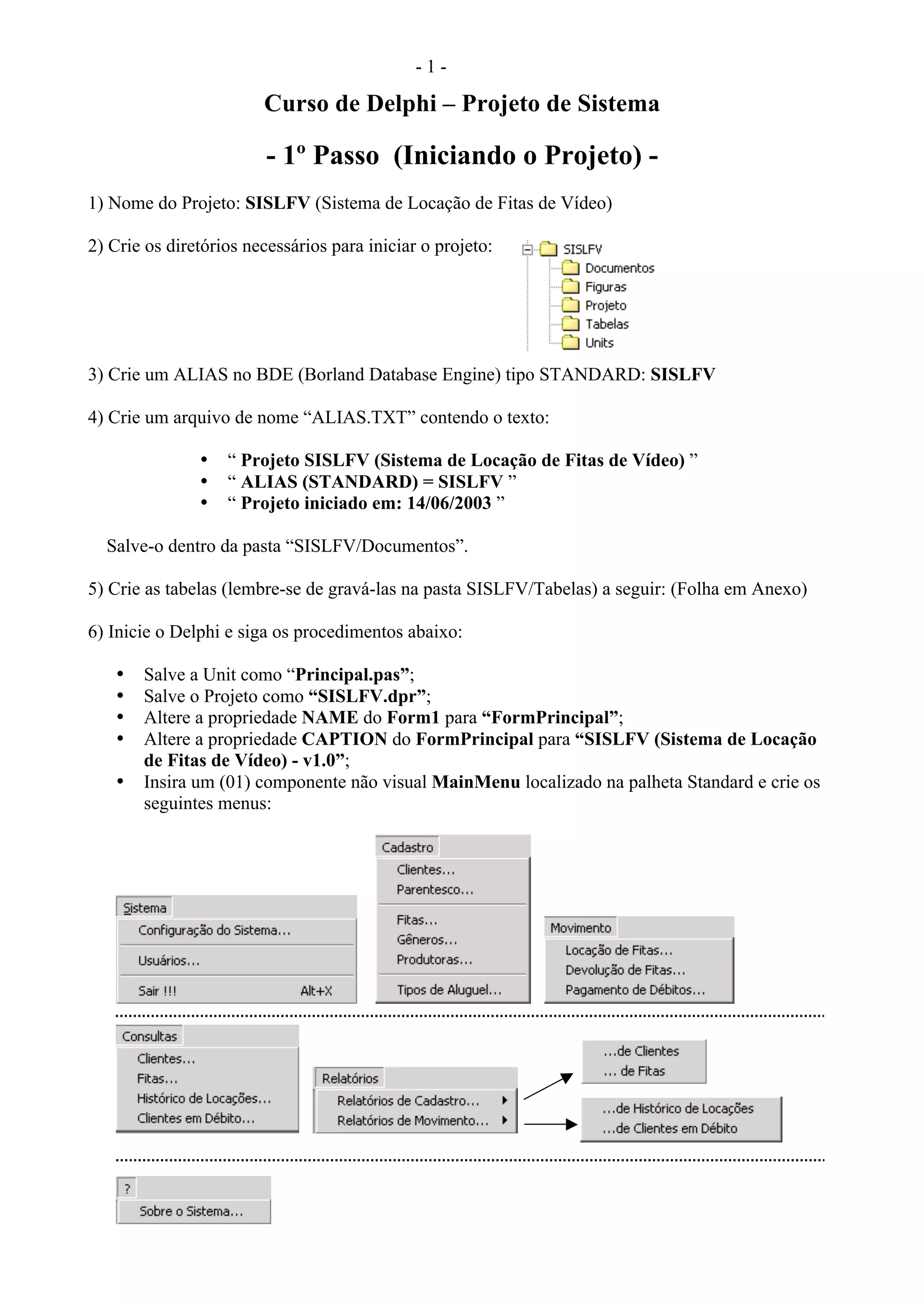 O documento fornece instruções para iniciar um projeto de sistema chamado SISLFV para locação de fitas de vídeo no Delphi. As instruções incluem criar diretórios e tabelas, configurar o projeto no Delphi, criar um formulário principal e dados module, e começar a desenvolver formulários para cadastro de clientes e dependentes.