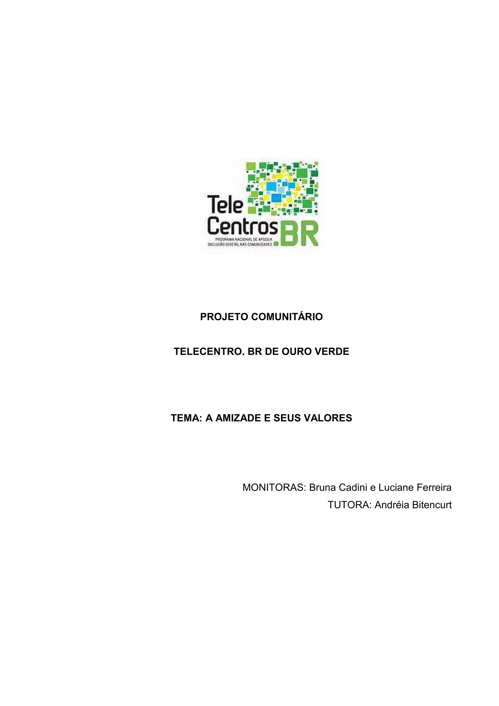 Este documento descreve um projeto comunitário sobre a amizade e seus valores realizado com crianças e adolescentes. O projeto teve como objetivo desenvolver boas maneiras e valorizar a amizade por meio de debates, vídeos e atividades dinâmicas como "O Abraço" e "O Espelho". O projeto ocorreu em dois programas assistenciais no município de Ouro Verde em Santa Catarina.