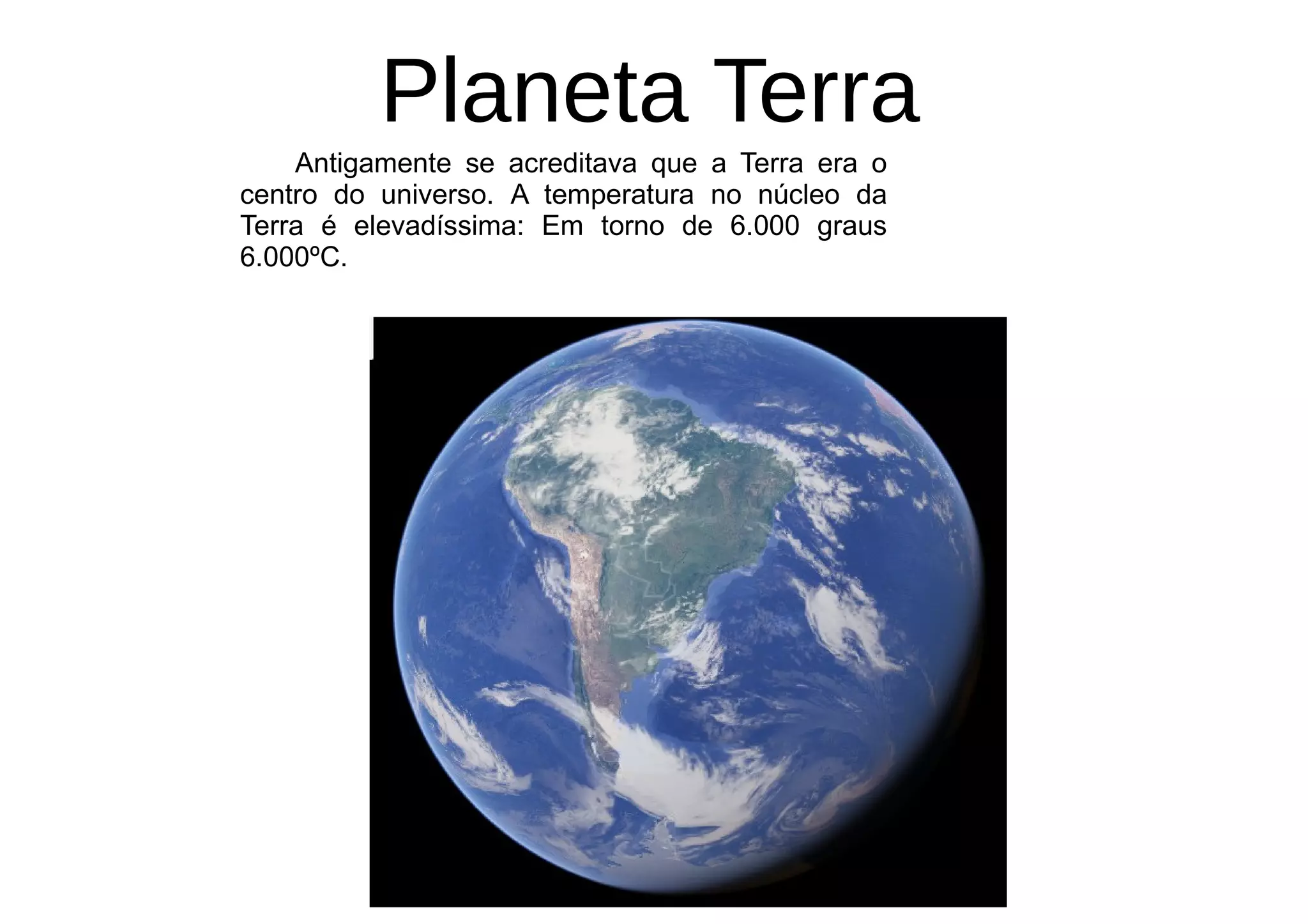 1) A Terra antigamente era considerada o centro do universo e sua temperatura no núcleo é de aproximadamente 6.000°C; 2) A América do Sul abriga as Cataratas do Iguaçu e a maior queda d'água do mundo, Salto Ángel, e é um subcontinente localizado no hemisfério sul; 3) O Rio de Janeiro já foi a capital de Portugal, tornando-se a única capital europeia fora da Europa, e o Brasil é o quinto maior país em territ