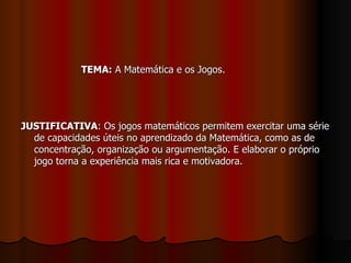 Este projeto propõe que os alunos do 7o ano criem um jogo matemático que explore operações com números inteiros. Os alunos terão 2 semanas para elaborar o jogo em grupo e depois apresentá-lo, sendo avaliados na clareza da explicação, domínio do conteúdo e participação.