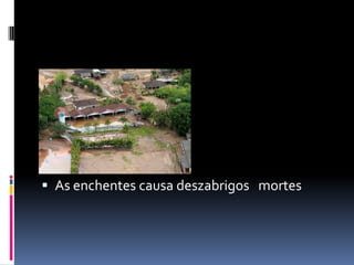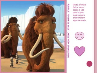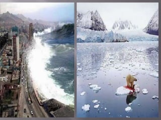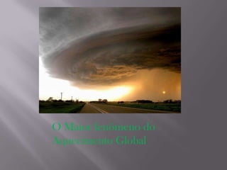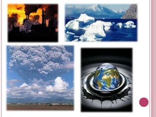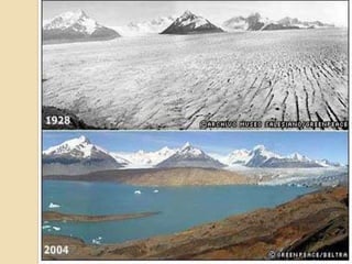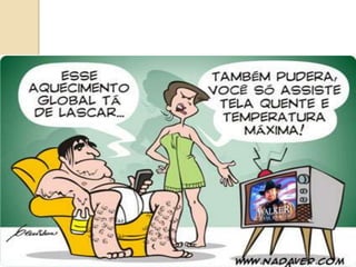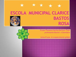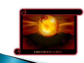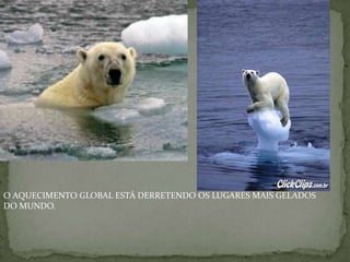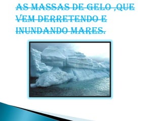 O documento apresenta trabalhos de alunos sobre as causas e consequências do aquecimento global. Os alunos discutem como o desmatamento, queimadas, emissão de gases do efeito estufa levam ao aumento da temperatura global, derretimento de geleiras e elevação do nível do mar.