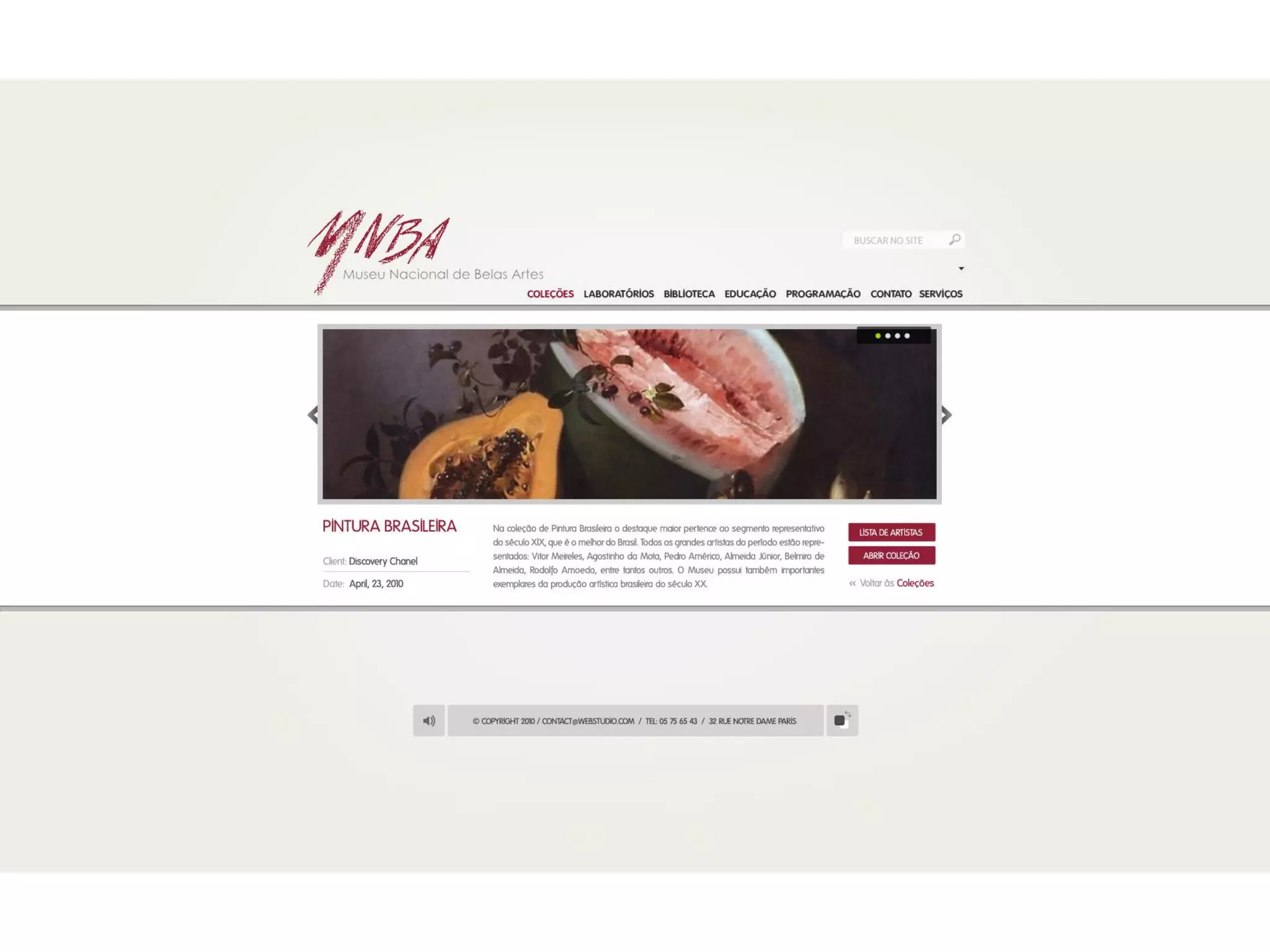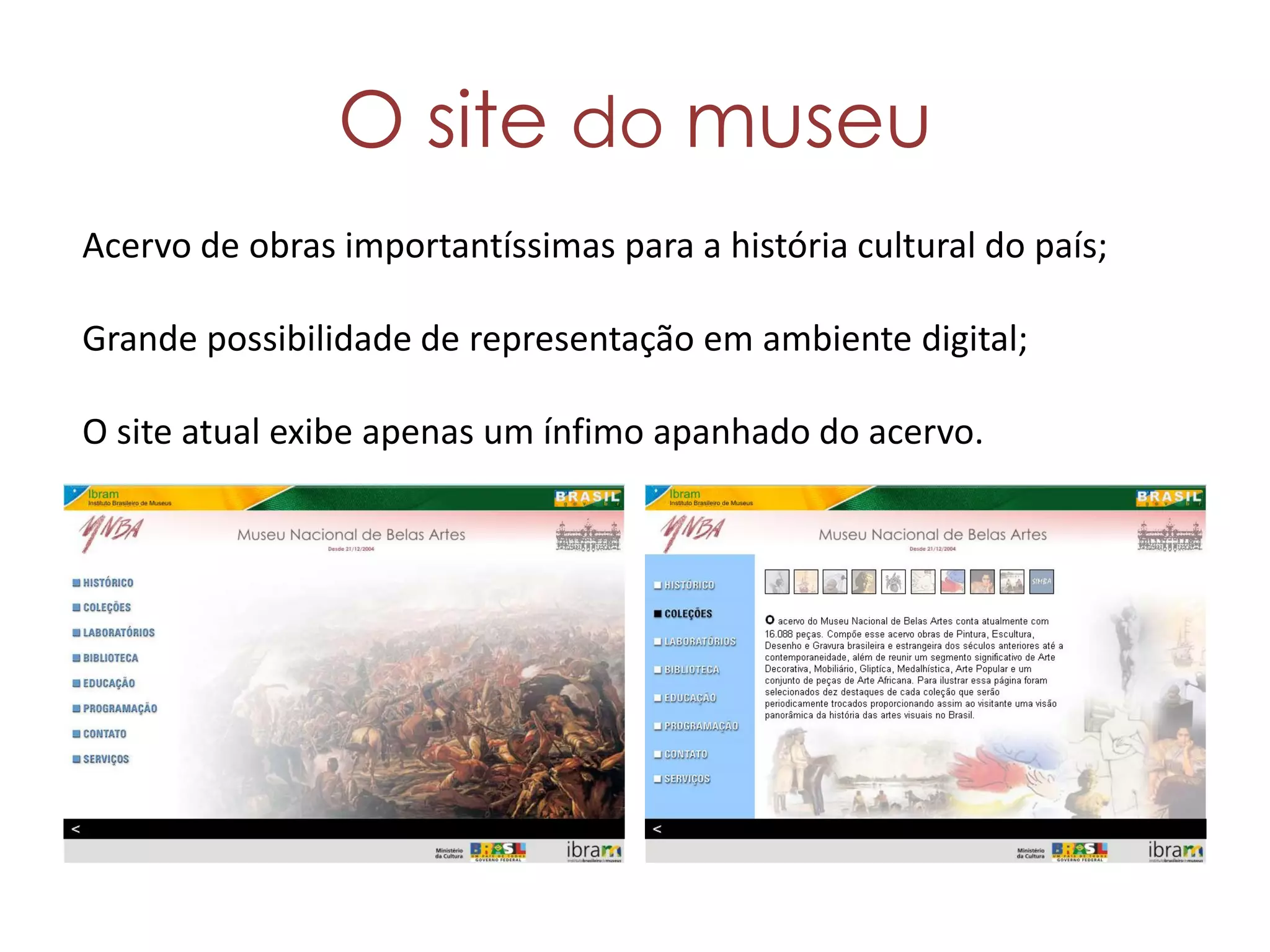 O documento propõe um novo site para o Museu Nacional de Belas Artes que digitalize seu acervo e forneça informações detalhadas sobre as obras em três níveis hierárquicos: coleções, autores e obras individuais, com funcionalidades interativas como ampliação de imagens.