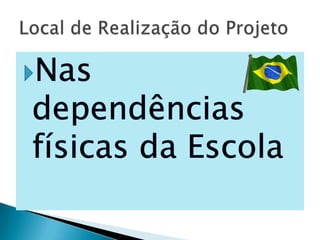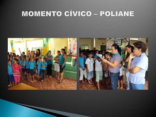 Este documento descreve um projeto para promover momentos cívicos na escola, incluindo cantar hinos nacionais e aprender sobre datas comemorativas. O projeto envolverá todos os alunos, professores e funcionários da escola e ocorrerá uma vez por semana de março a dezembro.