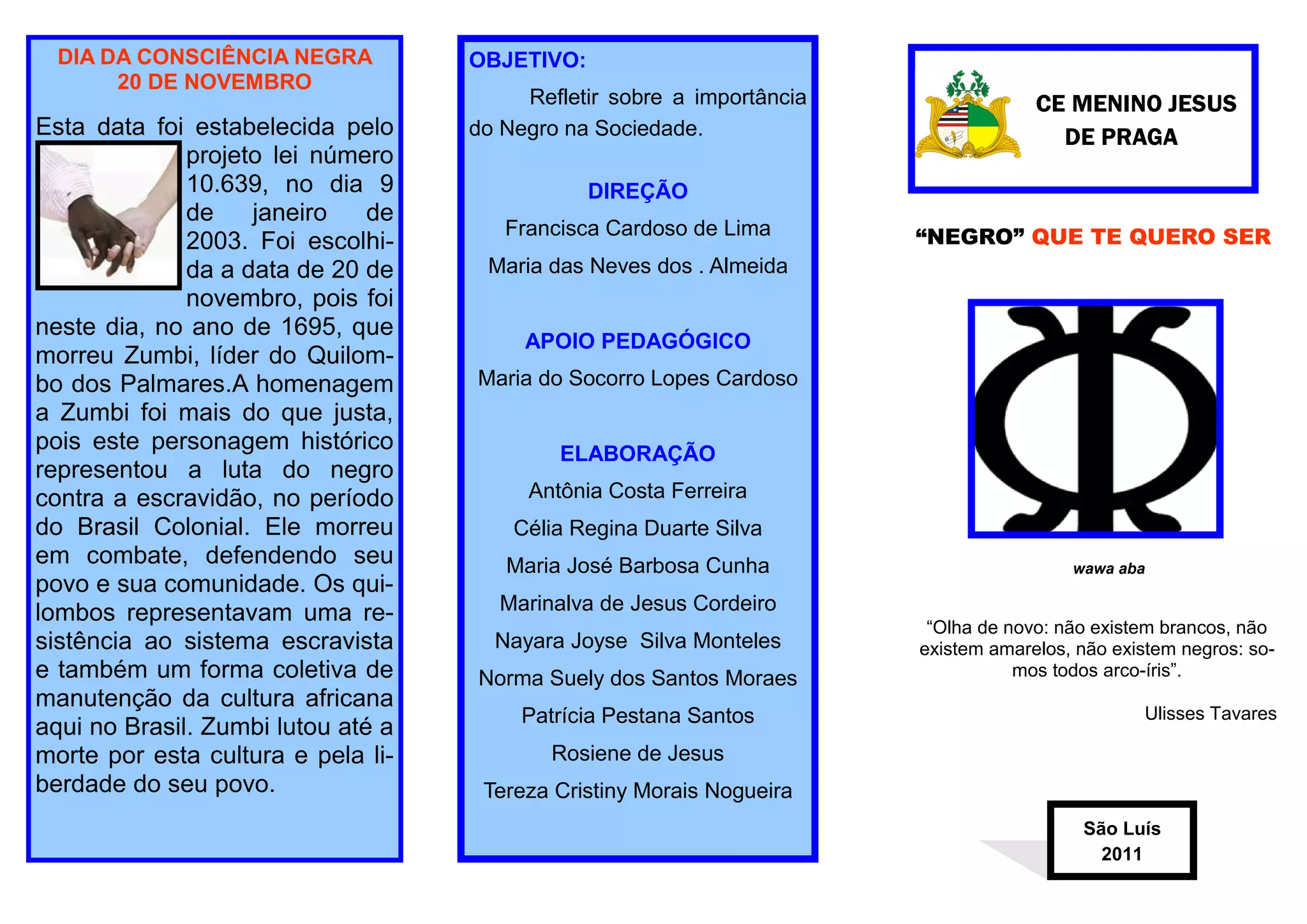 Este documento descreve as atividades planejadas para o Dia da Consciência Negra em uma escola. O dia será dedicado a refletir sobre a importância da cultura negra e sua contribuição para a sociedade brasileira através de apresentações, dramatizações e exposições celebrando a história e tradições afro-brasileiras.