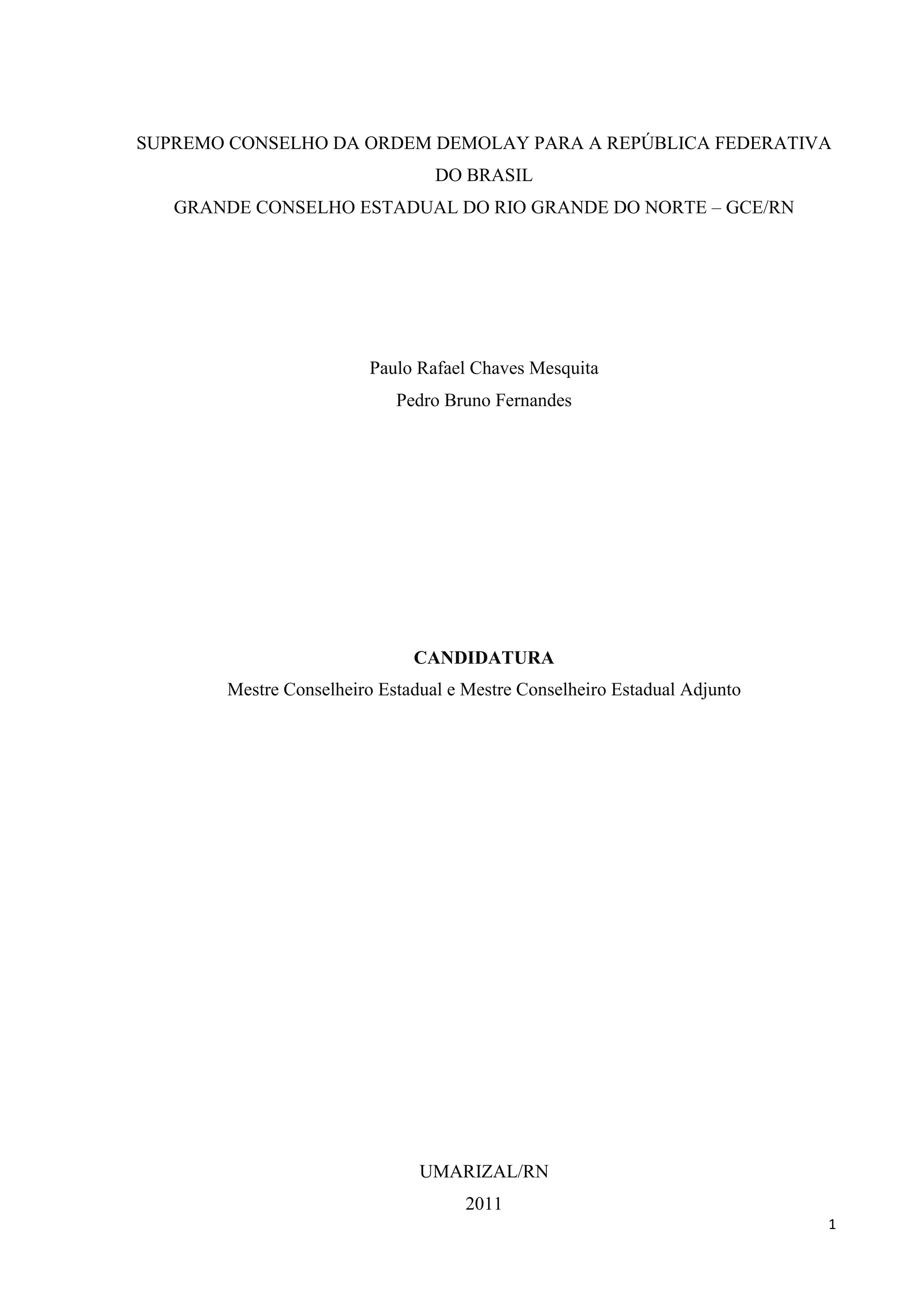 O documento apresenta a candidatura de Paulo Rafael Chaves Mesquita e Pedro Bruno Fernandes aos cargos de Mestre Conselheiro Estadual e Mestre Conselheiro Estadual Adjunto respectivamente para o Grande Conselho Estadual do Rio Grande do Norte. Ele descreve as qualificações e experiências dos candidatos na Ordem DeMolay, seus projetos e metas caso eleitos, a composição proposta para o gabinete estadual e considerações finais.