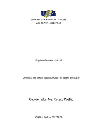 1. O documento discute a espetacularização do esporte no contexto das Olimpíadas Rio-2016, analisando como o esporte foi transformado em mercadoria e espetáculo sob a lógica do capitalismo globalizado.