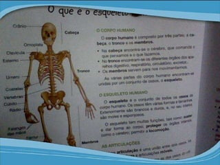 O corpo humano é composto de 206 ossos que formam o esqueleto. Os ossos protegem órgãos vitais e permitem movimento através de articulações. Manter os ossos fortes requer uma dieta balanceada rica em cálcio durante o crescimento e cuidados para evitar fraturas.