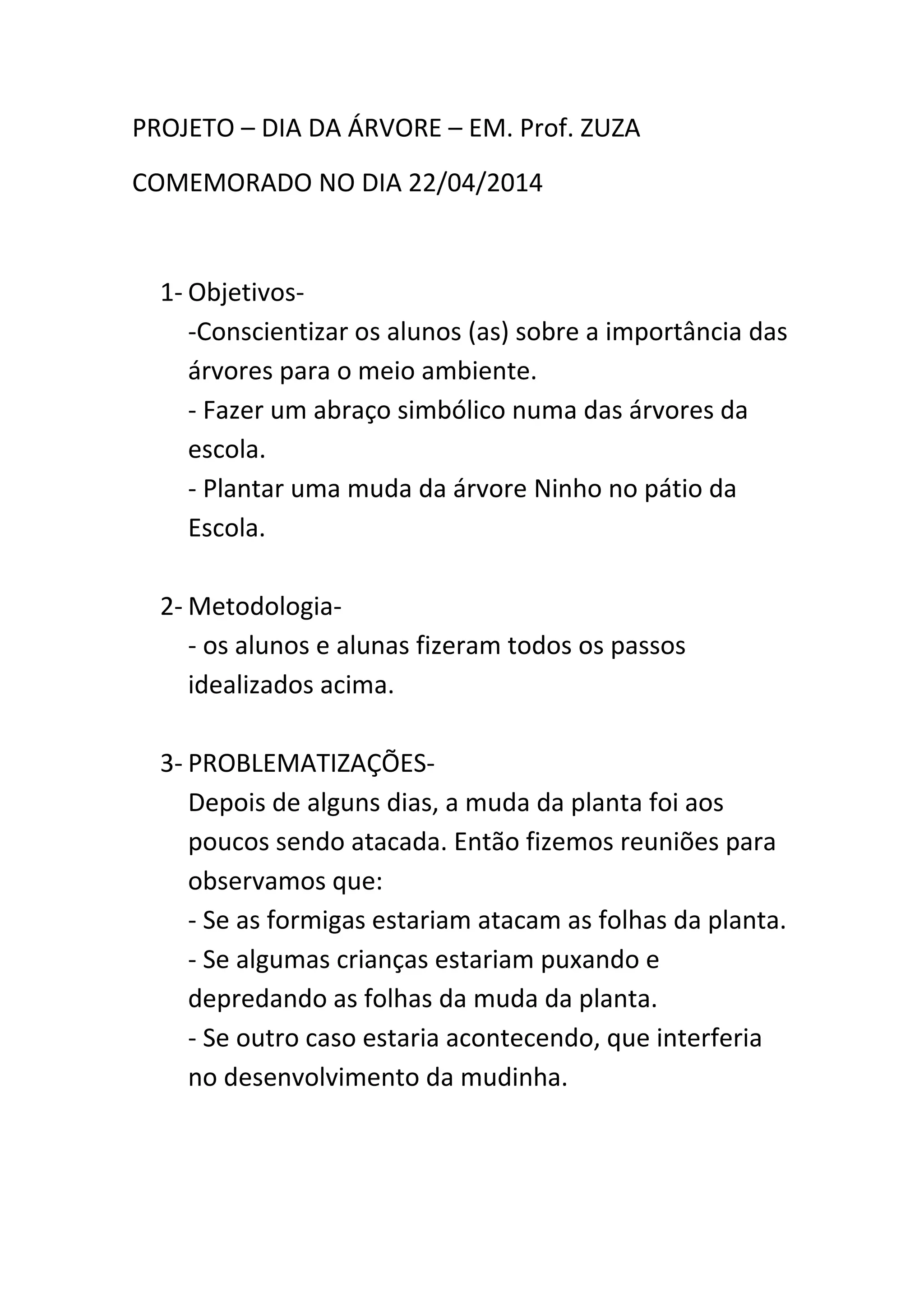 O documento descreve um projeto realizado no Dia da Árvore na escola em que os alunos plantaram uma muda e depois observaram problemas com seu crescimento. Eles descartaram que formigas ou crianças estavam danificando diretamente a planta, mas notaram que as crianças brincando em um coqueiro perto estavam caindo na muda e impedindo seu desenvolvimento.