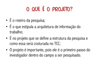 O documento fornece orientações para elaborar um projeto de pesquisa, descrevendo suas principais seções como escolha de tema, definição do problema, objetivos, justificativa, método, revisão bibliográfica e cronograma. O projeto é o roteiro da pesquisa e estabelece a estrutura e arquitetura da investigação.