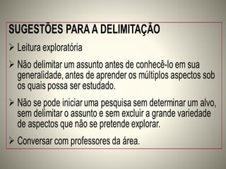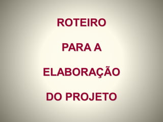 O documento discute os principais elementos de um projeto de pesquisa, incluindo a introdução, tema, justificativa, delimitação, problema, objetivos, metodologia e referências. Ele fornece orientações sobre como definir esses elementos e a importância de cada um para a condução de uma pesquisa científica.
