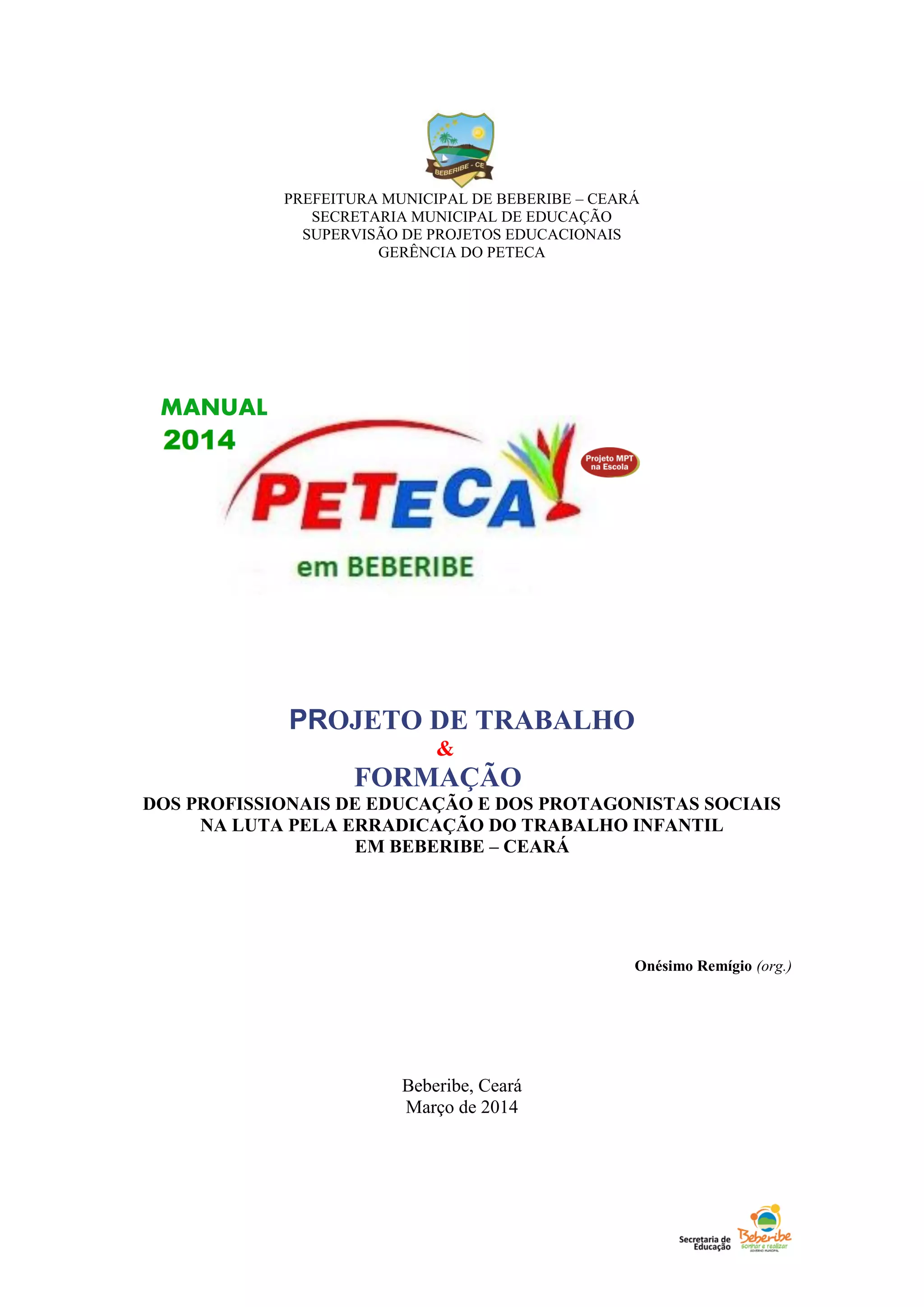 O documento apresenta as diretrizes do Programa de Educação contra a Exploração do Trabalho da Criança e do Adolescente (PETECA) em Beberibe, Ceará para 2014. O PETECA tem como objetivos principais intensificar a conscientização sobre a erradicação do trabalho infantil e fortalecer as políticas públicas de proteção à criança e ao adolescente. O documento detalha o público-alvo, a capacitação, a metodologia, o cronograma de atividades e os parceiros do programa.