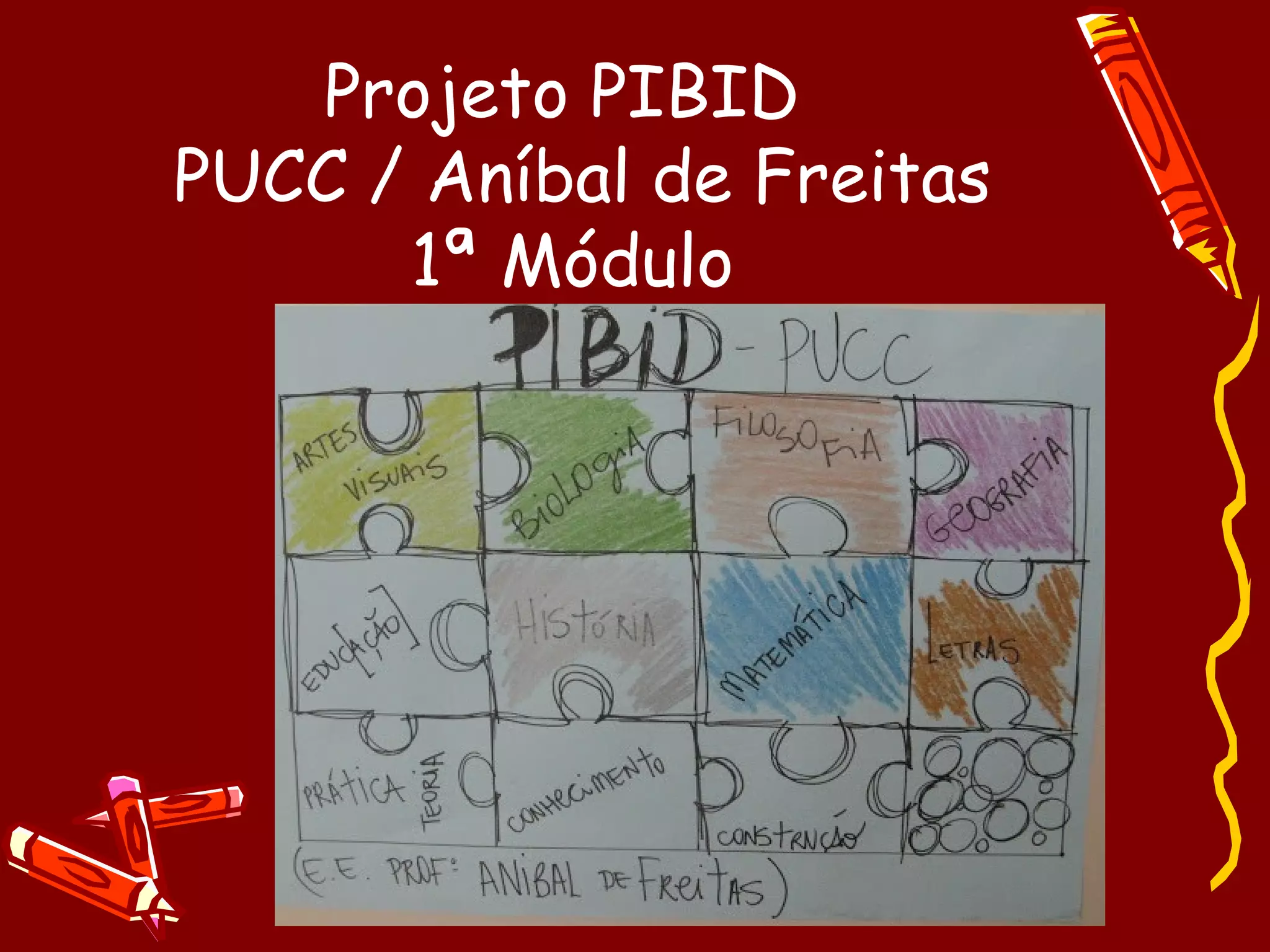O documento apresenta o projeto PIBID da PUCC, com os professores e bolsistas envolvidos nas áreas de Artes Visuais, Biologia, Filosofia, Geografia, História, Letras e Matemática. Também mostra atividades realizadas como divulgação do PIBID, socialização e organização de turmas em grupos temáticos.
