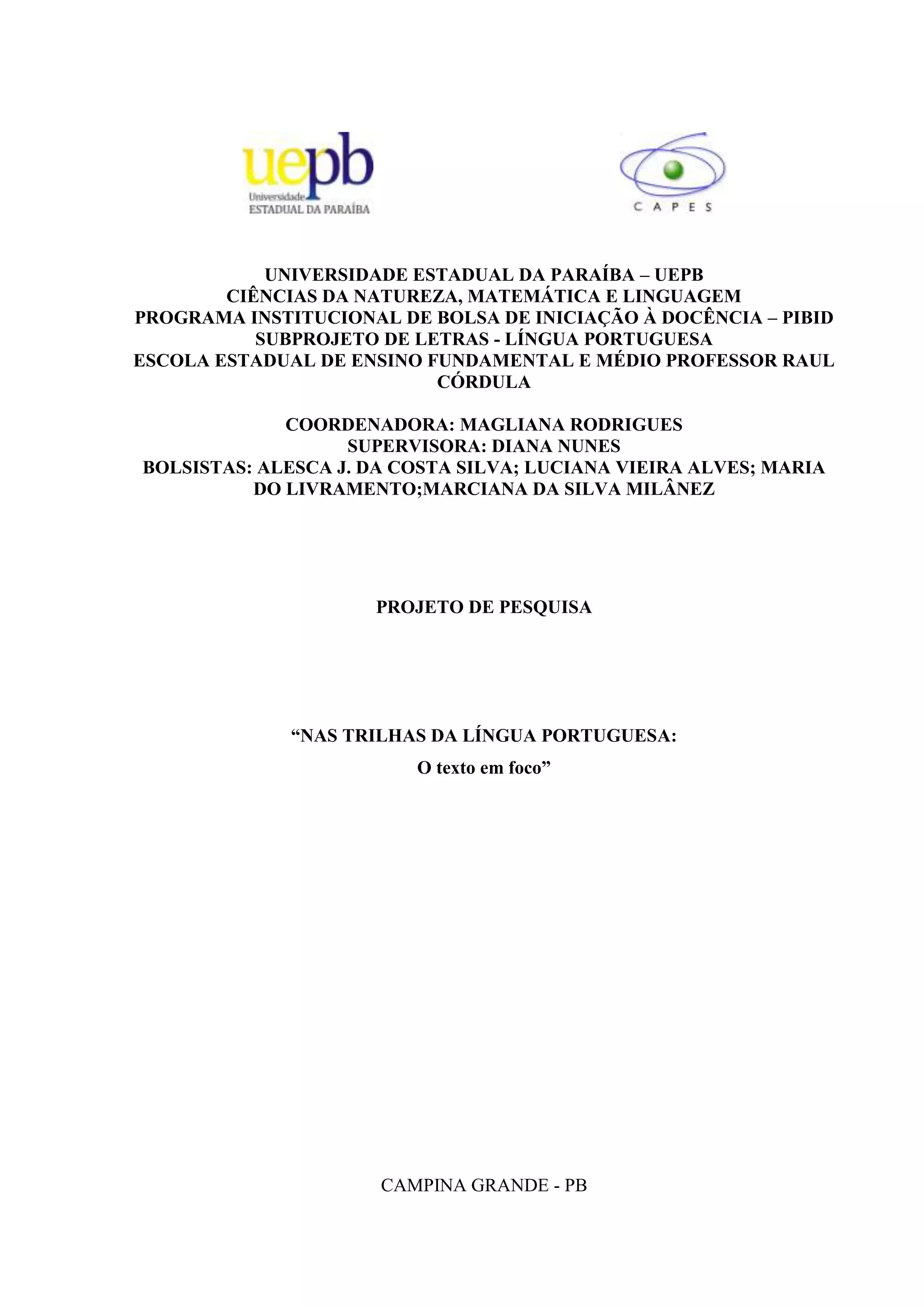 Este documento descreve um projeto de pesquisa desenvolvido por alunas do curso de Letras da Universidade Estadual da Paraíba visando incentivar o interesse dos alunos pelas aulas de língua portuguesa através de metodologias dinâmicas e relacionadas ao cotidiano dos estudantes, colocando o texto como foco central do processo de ensino-aprendizagem. O projeto será desenvolvido em uma escola estadual de Campina Grande e terá duração de agosto a dezembro de 2011.
