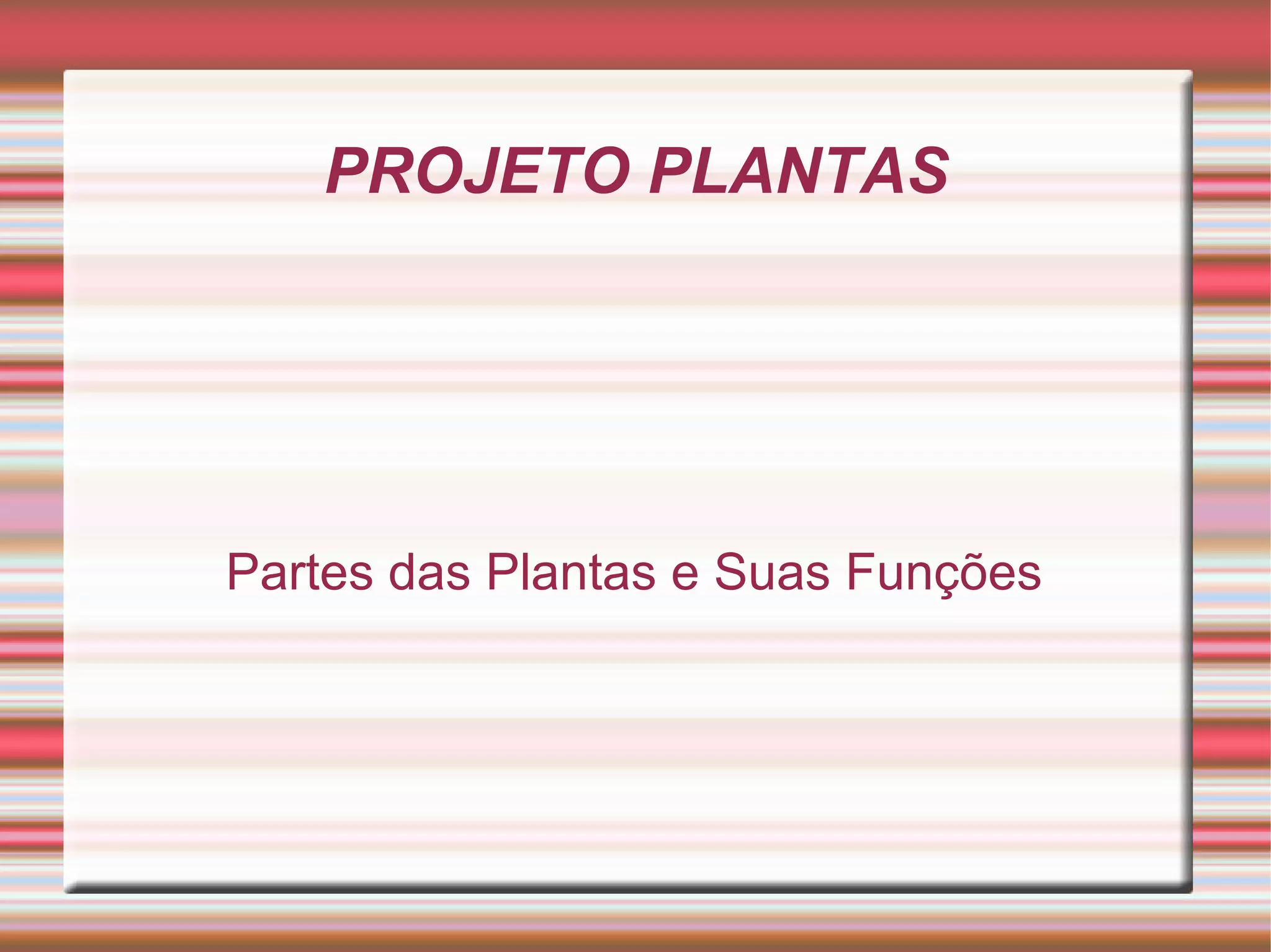 O projeto tem como objetivo ensinar aos alunos sobre as partes e funções das plantas através de pesquisas, cartazes, visita a uma reserva florestal, plantio de sementes e jogos educativos. Os alunos serão divididos em grupos para pesquisar cada parte da planta, como raiz, caule e folhas. Eles irão aprender sobre a importância das plantas para a alimentação, medicina e decoração.