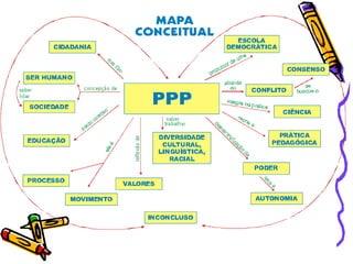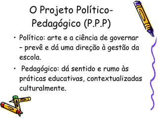 O documento descreve o Projeto Político-Pedagógico (PPP) da escola Nadjelena de Araújo Souza. O PPP prevê a gestão da escola e dá sentido às práticas educativas, sendo construído e vivenciado por todos os envolvidos no processo educativo. Ele se relaciona à dimensão política, articulando compromissos sociais à comunidade, e à dimensão educativa, com foco na formação do cidadão. Seus principais princípios são a participação, autonomia, gestão democr
