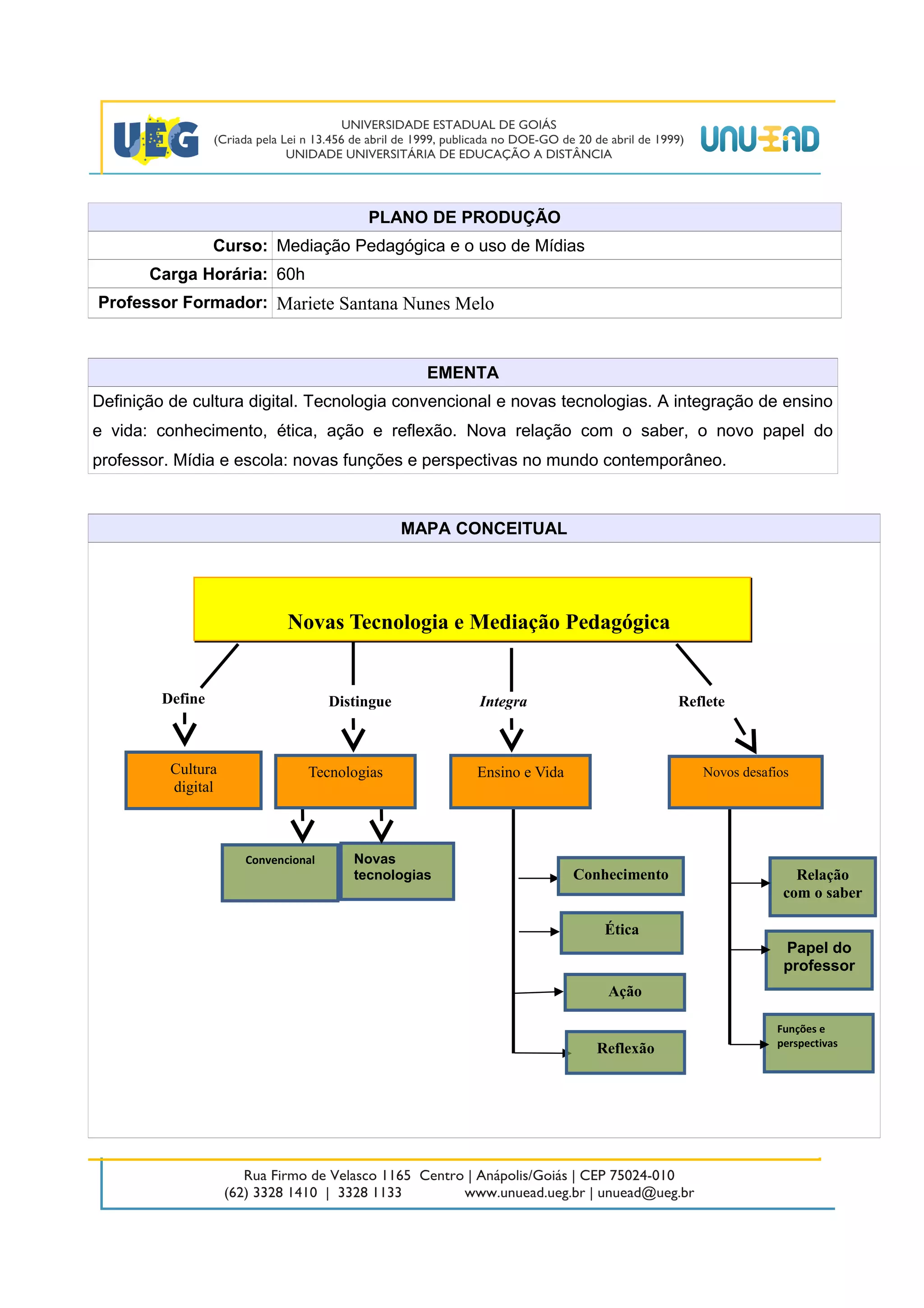 O documento apresenta o plano de produção de um curso sobre mediação pedagógica e uso de mídias com duração de 60 horas. O plano descreve a ementa, objetivos gerais e específicos, mapa conceitual, e três unidades temáticas abordando a evolução das mídias, mediação pedagógica e uso da tecnologia, e novos caminhos da educação.