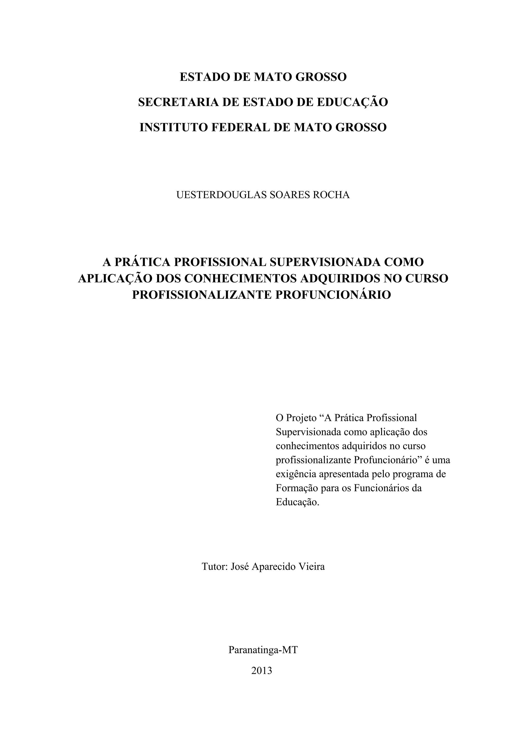 Este projeto descreve a importância da disciplina Prática Profissional Supervisionada (PPS) para o curso técnico Profuncionário, que exige atividades práticas aplicando os conhecimentos adquiridos. O projeto objetiva estabelecer uma relação entre teoria e prática para melhorar a qualidade das atividades dos cursistas em seus ambientes de trabalho.