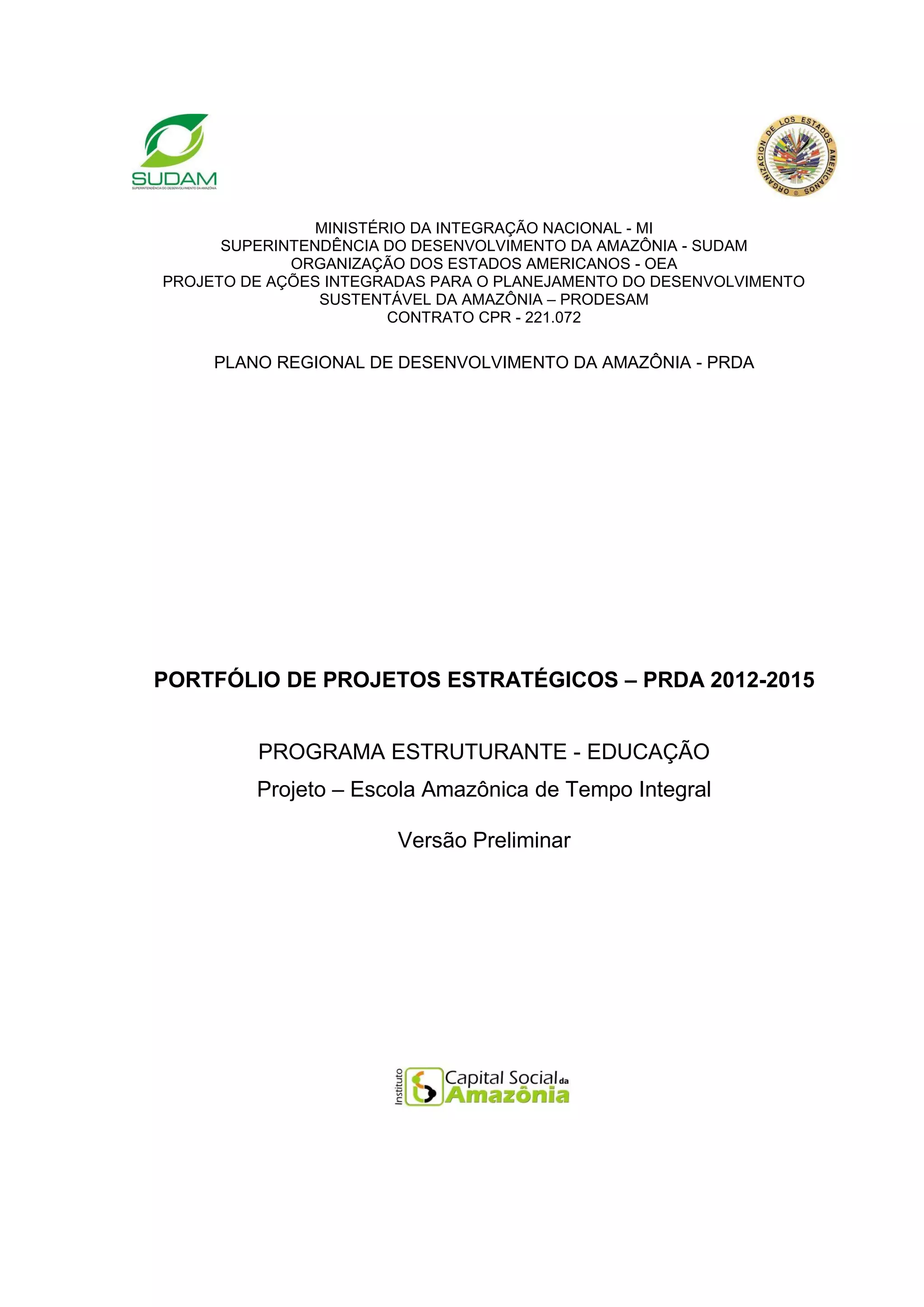 O documento apresenta um projeto para a implantação de Escolas de Tempo Integral na Amazônia entre 2012-2015. O projeto terá módulos urbano e rural, implantando escolas nas periferias de grandes cidades amazônicas e em reservas extrativistas, respectivamente. A justificativa é que escolas de tempo integral podem oferecer mais oportunidades educacionais e de sociabilidade para estudantes, especialmente na Amazônia, onde o acesso à educação é limitado em muitas áreas.