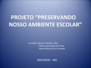 Este documento descreve um projeto desenvolvido por estudantes para promover a conscientização ambiental na escola através de atividades práticas de reutilização de resíduos e economia de recursos. O projeto visa estimular mudanças de hábitos para preservar o meio ambiente escolar e conscientizar sobre o consumo consciente de água e energia. As atividades incluem teatro, jogos, cartazes e customização de roupas usando materiais recicláveis.