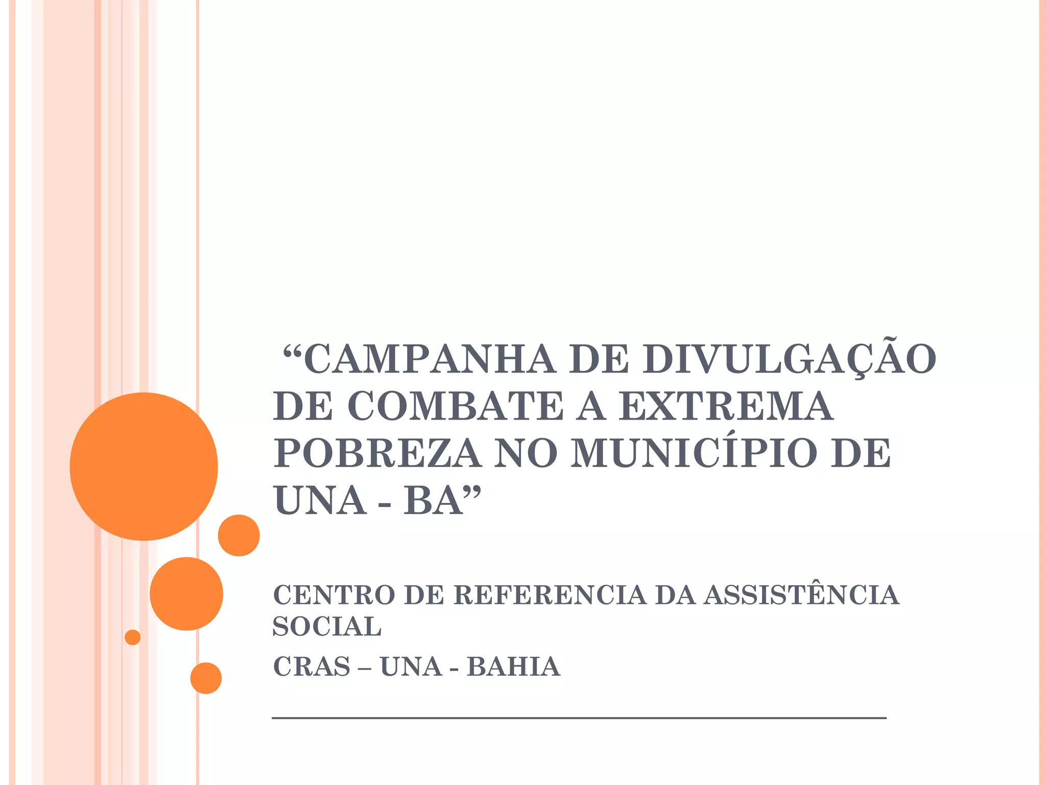 O documento descreve uma campanha de divulgação de ações de combate à extrema pobreza no município de Una, Bahia, com objetivo de informar e sensibilizar a população local sobre o assunto. A campanha visa famílias de baixa renda e contará com parcerias, cursos profissionalizantes, busca ativa de famílias rurais, palestras e inclusão em programas sociais.