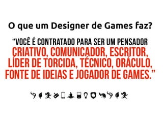 Um game designer é responsável por coordenar a produção de um jogo, definindo sua jogabilidade, conceito, regras e estrutura. É necessário ter formação em áreas como ciência da computação, sistemas de informação ou análise e construção de sistemas. O salário inicial é em torno de R$2.000,00 e carreiras afins incluem programadores, produtores, artistas, engenheiros de som e testadores.