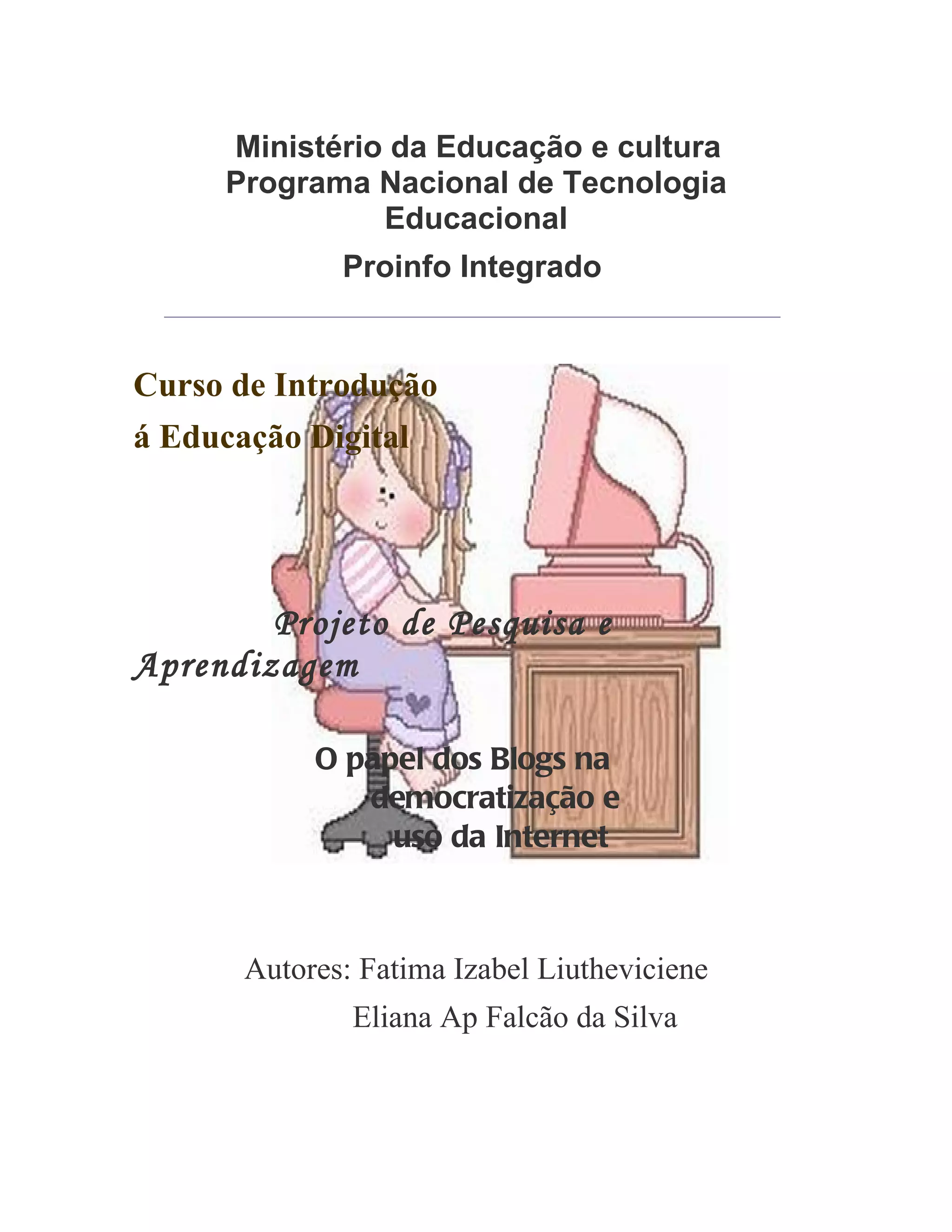 Este documento apresenta um trabalho de conclusão de curso de duas autoras sobre o papel dos blogs na democratização e uso da internet. O trabalho propõe estratégias de reforço escolar para alunos com dificuldades de aprendizagem em leitura e escrita, incluindo projetos de alfabetização e acompanhamento contínuo dos professores.