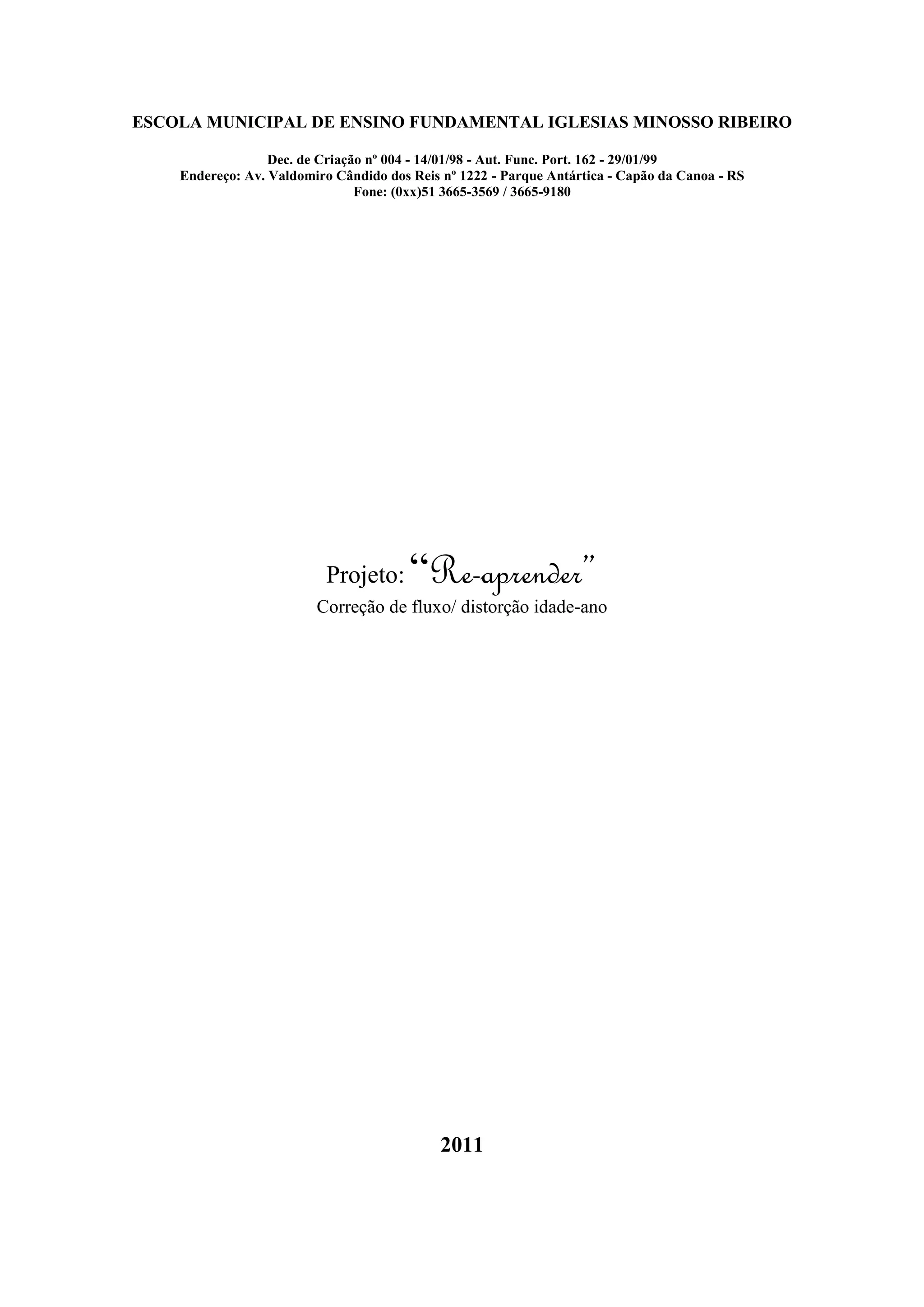 O documento descreve um projeto chamado "Re-aprender" em uma escola municipal que tem como objetivo corrigir a defasagem de idade/ano de alunos com dificuldades de aprendizagem, oferecendo condições para que possam avançar para séries superiores. O projeto será realizado ao longo do ano letivo de 2011 com alunos do ensino fundamental das séries iniciais e contará com duas turmas, utilizando metodologias diferenciadas e tecnologias para apoiar o desenvolvimento das habilidades dos alunos.
