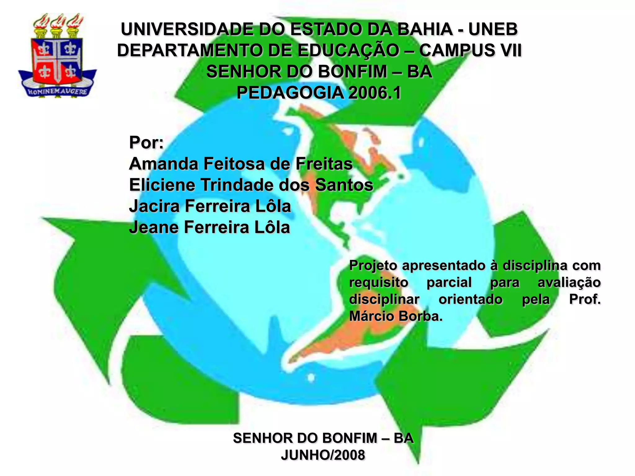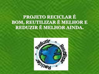 Este projeto visa conscientizar alunos do 5o ano sobre a importância da reciclagem, reutilização e redução do lixo. Serão realizadas atividades interdisciplinares em português, ciências, história, artes e matemática utilizando leituras, debates, oficinas e passeios para promover a sensibilização ambiental dos estudantes. Ao final, haverá uma exposição dos trabalhos produzidos para as famílias.