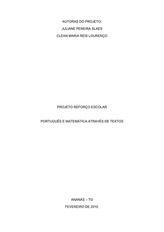 O documento descreve um projeto de reforço escolar em Português e Matemática para alunos do 6o ao 8o ano do Ensino Fundamental. O projeto visa melhorar o desempenho dos alunos nessas disciplinas através de atividades baseadas em textos de diferentes gêneros. Serão realizadas aulas semanais para turmas de até 10 alunos utilizando diversas técnicas como leitura, produção de textos, resolução de problemas matemáticos e jogos educativos. A avaliação dos alunos será