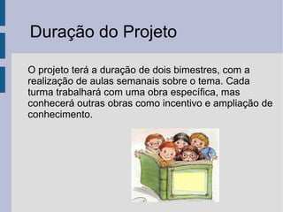 O projeto terá a duração de dois bimestres e irá comemorar os 100 anos de Vinícius de Moraes, importante poeta brasileiro. Cada turma irá estudar uma obra específica de Moraes, mas também conhecer outras obras. O objetivo é oportunizar os alunos o acesso à literatura de Moraes e estimular a participação por meio de atividades artísticas e culturais.