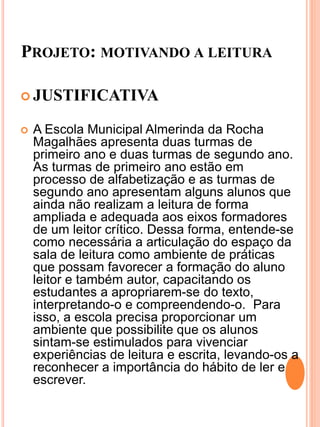 Este projeto visa motivar a leitura entre alunos do 1o e 2o ano do Ensino Fundamental em uma escola municipal. Será criada uma sala de leitura para oferecer atividades lúdicas como contação de histórias e jogos. Alunos com dificuldades receberão reforço individualizado. O objetivo é que todos desenvolvam habilidades de leitura crítica até dezembro de 2017.