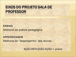 O documento fornece diretrizes para a elaboração de projetos para a Formação no Projeto Sala de Professor, com foco na melhoria do ensino e da aprendizagem. Deve conter informações sobre o problema pedagógico, objetivos gerais e específicos, metodologia, cronograma e referências bibliográficas.