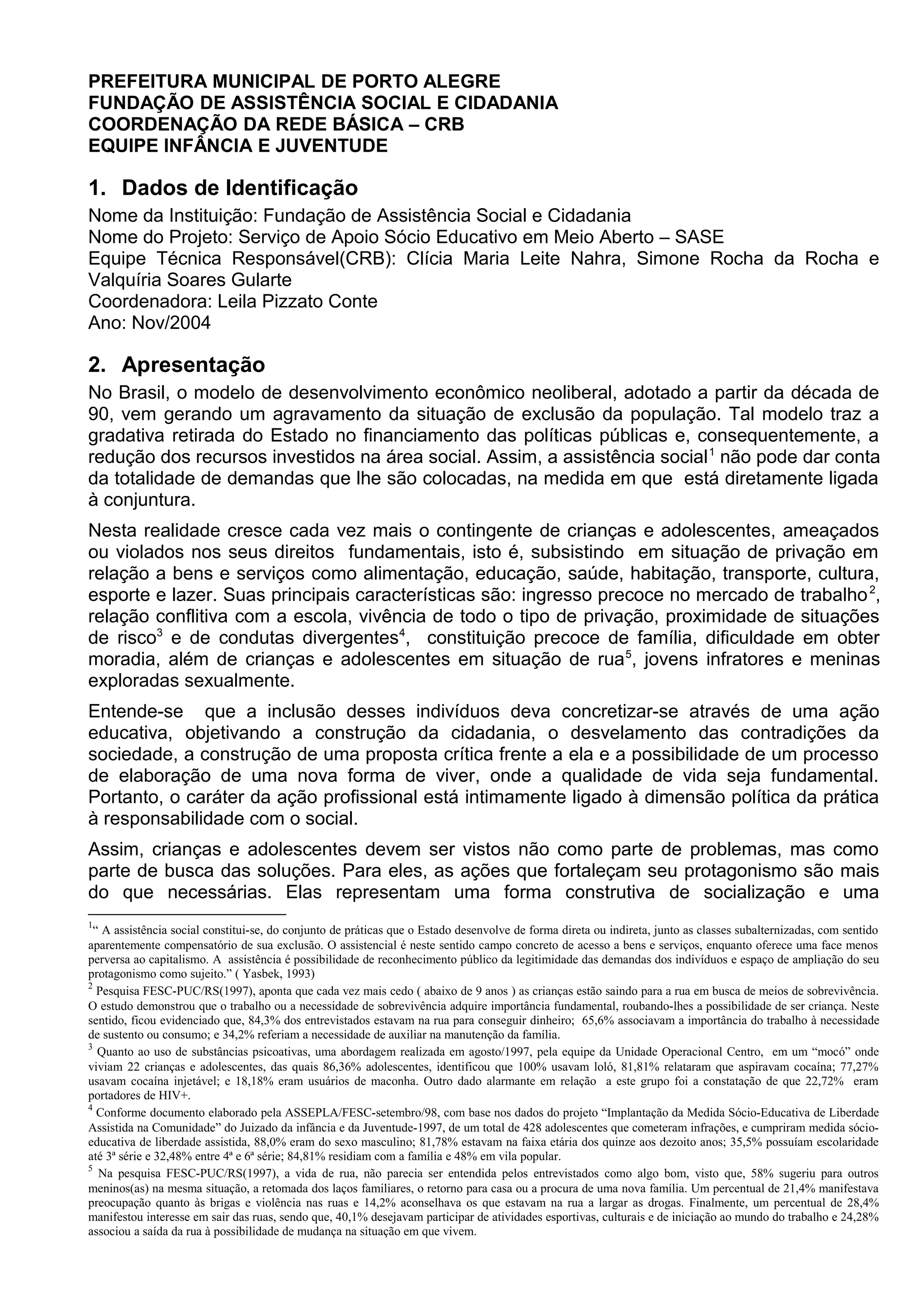 O documento apresenta um projeto da Fundação de Assistência Social e Cidadania chamado Serviço de Apoio Sócio Educativo em Meio Aberto, que tem como objetivo apoiar crianças e adolescentes em situação de risco através de ações educativas que promovam a cidadania e a inclusão social. O projeto se baseia em referenciais legais como o Estatuto da Criança e do Adolescente e referenciais teóricos que enxergam a educação como um processo de construção da participação cidadã.