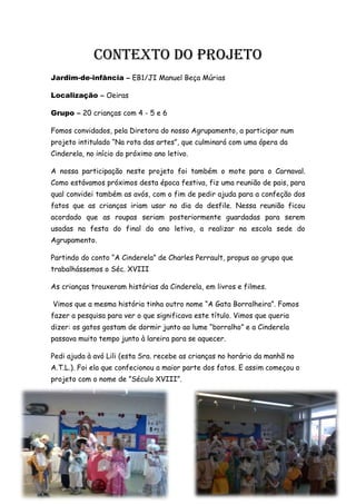 Este projeto teve como objetivo explorar o Século XVIII através da história da Cinderela. As crianças pesquisaram como era a vida nessa época por meio de livros, filmes e perguntando aos pais e avós. Elas desenvolveram atividades como pintura, modelagem e dramatização para aprender sobre a moda, transportes e vida nos palácios daquela época.