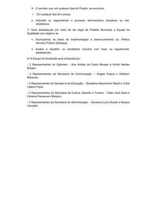 O documento descreve o Projeto Servidor Público Destaque lançado pela Prefeita de Viana para estimular valores como dedicação, conduta exemplar e eficiência entre os servidores públicos municipais. O projeto premiará anualmente os melhores servidores de cada secretaria e autarquia em uma solenidade pública. Um regulamento detalha os critérios e processo de eleição dos servidores destaque.