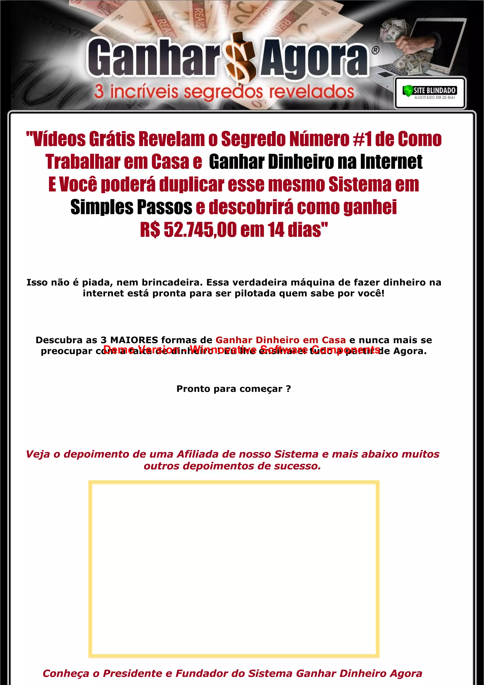 1) O documento promove um sistema para ganhar dinheiro na internet de forma rápida e fácil, alegando que o autor ganhou R$52.745 em 14 dias usando o método.