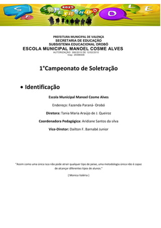 Este documento descreve um projeto de um campeonato de soletração realizado na Escola Municipal Manoel Cosme Alves para incentivar o desenvolvimento ortográfico dos alunos de forma lúdica e competitiva. O projeto inclui objetivos, metodologia, avaliação e regulamento para a competição de soletração entre alunos do 6o ao 9o ano.
